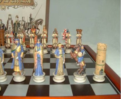 This chess set epitomises the struggles for domination between Christians and Muslims. This conflict has continued intermittently for over a thousand years but it is the period between 1095 and 1292 which has captured our imagination because of the exploits of the Crusader Knights. Stories of heroes of the Crusades abound in all cultures. We invite you now to create your own heroes and villains from within the characters of our chess set.