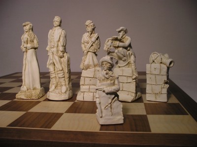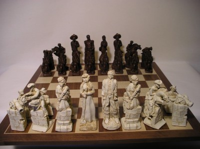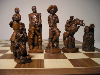Depicting the Mexicans against the Americans. On the Mexican side, Santa Anna is the King with a Mexican lady as Queen. On the American side Jim Bowie is the King with his lady as Queen. Davy Crocket is the Bishop.