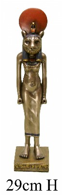 The goddess of bravery and courage, Sekhmet was usually shown as a woman with the head of a lion or lioness. Her name means "The Powefull One". at Memphis Sekhmet was honored as the wife of the creator god Ptah. At Thebes she was worshipped as a form of Mut, the queen of the gods.