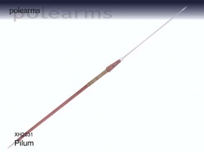 The Roman trooper typically carried at least one Pilum, a weapon as intrinsic to Roman combat tactics as the short sword. The Pilum had a long, relatively soft iron shaft which, though certainly capable of penetrating its intended target, was likely to bend on striking armor or the ground, thus making it useless to be thrown back. A common tactic when using the Pilum against troops with shields was to pierce the opponent’s shield, whereupon the shaft would bend, making extraction difficult. The opposing soldier, thus encumbered, was likely to throw down his shield, losing his defense against the infamous Roman short sword. Our Pilum is of the traditional flanged type and may be disassembled for ease of transportation to events.