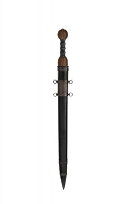 The Roman Dagger (SH2139), or Pugio, replicates an original that survives in remarkably good condition in a European musuem. The classic broad, waisted blade is ridged and fullered for stiffness and lightness, and the full-width tang matches the profile of the grip. The decoration of the grip an scabbard, like the original, are decorated in a silver on black niello style. A perfect piece for Roman persona.