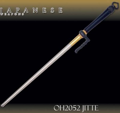 Our Jitte (OH2052) is now available for the jiujutsu practitioner. Carried by the police in old Japan, the jitte was a versatile weapon that could be used to attack the neck and head of an opponent, but its primary use was a sword catcher and deflector. There are many stories of jittejutsu “masters” snapping katana blades or disarming their owners. The Jitte features a 10 3/4” round-section steel rod and a leather wrapped grip with a finger-width blade trapper.