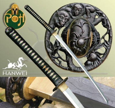 We’ve been asked many times for limited editions of Hanwei Samurai swords and we think that we’ve found a winner in the Momo-no-Saru (or Peach Monkey). Limited to 500 Katana and 125 Wakizashi worldwide, the swords are built on folded Swedish powder-steel blades with the finest quality furniture. The blackened iron Tsuba and Fuchi/Kashira depict monkeys raiding a peach tree – a traditional favorite in Japan. Each sword comes with a numbered Certificate of Authenticity.