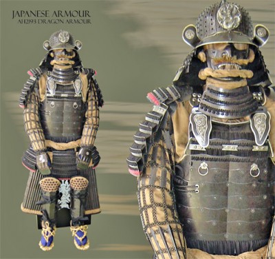 Hanwei’s Dragon Armour, named for the helmet crest (mon), is made for the connoisseur of Japanese armours. It faithfully replicates a “Byotoji Do Gusoku” from the Edo period which, like many fine armours, incorporates an earlier helmet bowl from the Momoyama period. European influence on Samurai armour is discernible in the slight median ridge to the front section of the byotoji okegawa do (breastplate) which, by this period, was designed to deflect musket balls. The plates of the do, with waved edges, are fastened with elaborate shakudo rivets in the form of flowers with gilt centers. This feature illustrates the Japanese preference for a more flexible style of armour than the typical European one-piece breastplate construction. The carrying chest/display seat (hitsu) is black lacquered with the Dragon mon emblazoned in silver on the front panel. Overall, the antiqued patina of the gusoku gives a period appearance and provides a rich addition to any Japanese décor. Our full-sized suits of Samurai armour provide displays of outstanding quality for the den or the dojo. Crafted by the armourers of CAS/Hanwei, the armour is authentically detailed and completely realistic. These very affordable pieces are made with traditional styling and materials and are wearable (within a reasonable size range!). They are supplied in the customary black lacquered box, along with an included wooden frame, provides the support for the display.