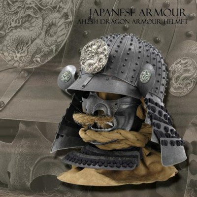 The original of the kabuto (helmet) of the Dragon Armour is interesting inasmuch as the bowl of the helmet came from the Momoyama period. The suji bachi style of bowl, with overlapped and riveted plates was typical of the finest helmet makers (katchu-shi) of this period, borne out by the signature of the Saotome smith “Ienao” on the back plate. The menpo (mask) is a typical ressei men of the type made in Nara. Mounted on a solid wood display stand, this helmet will be an outstanding addition to any collection and will complement any décor beautifully
