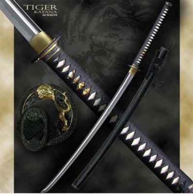 Each piece in the Tiger series has a hand-forged and folded ASSAB-K120C powder steel blade, differentially tempered using the traditional claying method to produce an HRC60 edge, HRC40 back. The temper line (hamon) is prominent and the grain pattern (hada) shows distinct layering. Saya are deeply lacquered in black, with inlaid brass bamboo leaves. The ray skin (same) used on the tsuka is of the highest quality, and the tsuka-ito and sageo on all three pieces are woven from best quality Japanese cotton. The Fuchi, Kashira, Kojiri, Koiguchi and Kurigata are all made from blackened bronzed iron, selectively detailed in gold. The Tsuba of the Katana and Wakizashi are made from blackened iron, with a “stalking tiger” inlaid in brass. The Habaki is of one-piece brass construction. The blades of all three pieces are grooved on both sides (bo-hi), with a short (ko) Kissaki on the Katana and Wakizashi. Also available Wakisashi SH1205 and Tanto SH1206