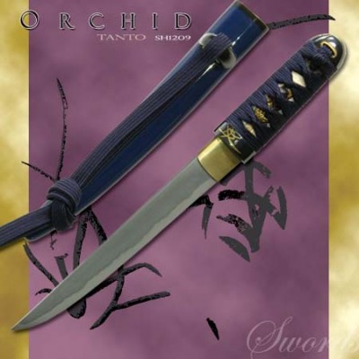 Each piece in the Orchid Series (SH1207, SH1208, & SH1209) has a hand-forged & folded K120C powder steel blade, differentially tempered using a traditional claying method to produce an HRC60 edge, HRC40 back. The temper line (hamon) is evident and prominent and the grain pattern (hada) shows distinct layers. The saya are deeply lacquered in blue. High quality ray skin (same) is used on the tsuka, and the tsuka-ito and sageo on all three pieces are woven from premium Japanese cotton. The tsuba of the katana and wakizashi is of blackened iron, with an Orchid and Butterfly decoration inlaid in silver, brass and copper. The scabbard mouth (koiguchi) and cord knob (kurikata) are of buffalo horn, and the fuchi, kashira and kojiri are of blackened bronzed iron with silver and gold detailing. The blade collar (habaki) is a one-piece brass construction. The katana and wakizashi feature a medium-length (chu) kissaki. Also available Katana SH1207 and Tanto SH1209.