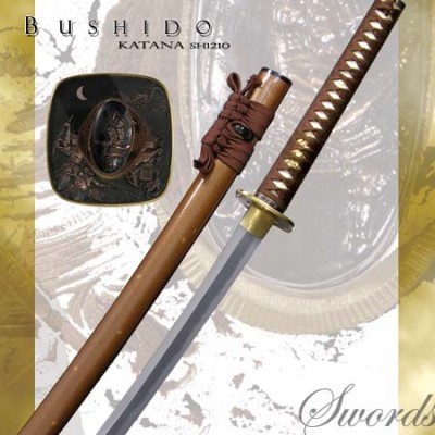 Each piece in the Bushido Series (SH1210, SH1211, & SH1212) has a hand-forged & folded K120C powder steel blade, differentially tempered using a traditional claying method to produce an HRC60 edge, HRC40 back. The temper line (hamon) is evident and prominent and the grain pattern (hada) shows distinct layers. The saya are deeply lacquered in gold with inlaid brass cherry blossom (sakura) flowers. High quality ray skin (same) is used on the tsuka of the katana and wakizashi, while the tsuka of the tanto is a gold-plated brass with a battle-scene decoration in relief. The tsuba of the katana and wakizashi is of blackened and bronzed iron, with detailing in gold and silver and a battle scene decoration. The tsuka-ito on the katana and wakizashi and the sageo on all three pieces are woven from premium Japanese cotton. The fuchi and kashira are of blackened bronze with brass detailing, and the kojiri, koiguchi and kurikata are of polished buffalo horn. The blade collar (habaki) is a one-piece brass construction. The katana and wakizashi blades are un-grooved. The katana and wakizashi have medium-length (chu) kissaki. Also available Katana SH120 and Tanto SH1212