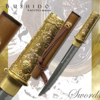 Each piece in the Bushido Series (SH1210, SH1211, & SH1212) has a hand-forged & folded K120C powder steel blade, differentially tempered using a traditional claying method to produce an HRC60 edge, HRC40 back. The temper line (hamon) is evident and prominent and the grain pattern (hada) shows distinct layers. The saya are deeply lacquered in gold with inlaid brass cherry blossom (sakura) flowers. High quality ray skin (same) is used on the tsuka of the katana and wakizashi, while the tsuka of the tanto is a gold-plated brass with a battle-scene decoration in relief. The sageo on all three pieces are woven from premium Japanese cotton. The fuchi and kashira are of blackened bronze with brass detailing, and the kojiri, koiguchi and kurikata are of polished buffalo horn. The blade collar (habaki) is a one-piece brass construction. The tanto blade is grooved (bo-hi) on both sides. Also available Katana SH1210 and Wakisashi SH1211