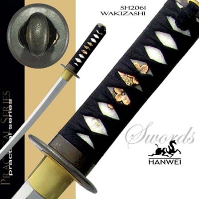 Now available Practical Wakisashi to match the ever-popular Practical Katana (SH1070) and the Practical Tanto (SH2254), offering the same quality at a great price. Blades are forged and differentially tempered to producing an HRC60 edge and HRC40 back. The temper line is authentic and prominent. Cost savings are effected by using fittings which, while making no claims to authenticity, are very strongly built to withstand the rigors of cutting exercises.
