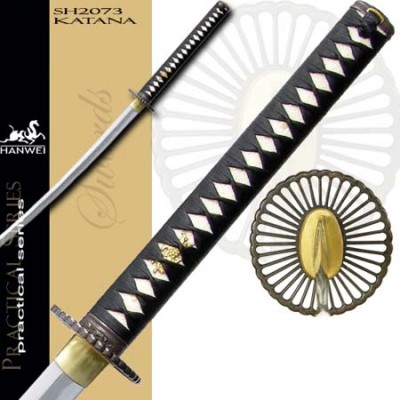 The “Practical Plus” Katana provides a very economical cutting sword as dependable as the Practical Katana (SH1070), but using more traditional fittings and construction methods. The blade is forged and differentially tempered (HRC60 edge, HRC40 back) and the hamon is prominent. The Practical Plus features genuine Same (Rayskin) on the Tsuka, with a wrap (Tsuka-Ito) specially developed for its gripping qualities. The long tang is double-pegged for security. The fittings of the Practical Plus are decorated in a Japanese Dogwood motif with dragon menuki, and the handsome Tsuba is of an iron. Also available in the Practical Plus Series SH2118 (Practical Plus Wakisashi) and SH2259 (Practical Plus Tanto)