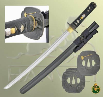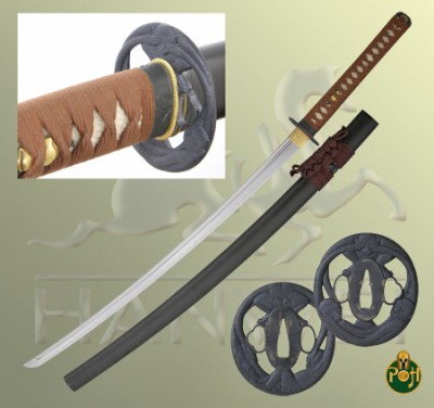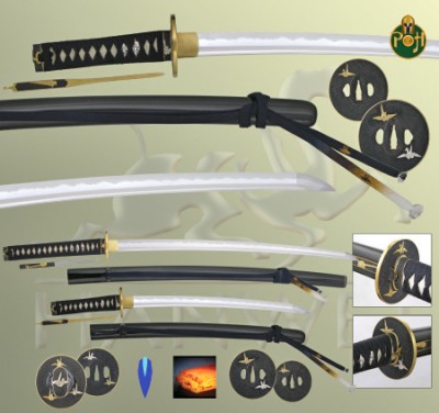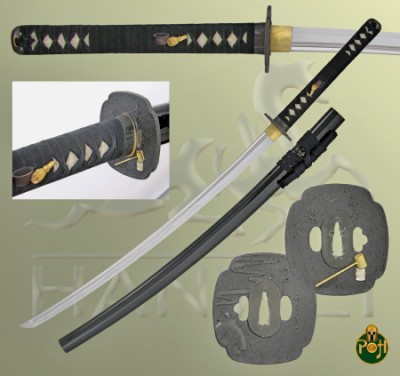 Our Paper Crane Daisho (SH2294-Katana / SH2328-Wakizashi) is without doubt the greatest achievement in sword making artistry yet available from Hanwei. The blade is crafted from Hanwei’s own Tamahagane steel (see below) while the fittings reflect the atmosphere of the Japanese theater. The Daisho’s name stems from the origami (the art of paper folding) cranes that decorate the striking Tsuba and Fuchi/Kashira, all of which feature highly-prized “Nanako” or stippled backgrounds. The Menuki feature thespian masks, a symbol shared by the Japanese theater and its western counterpart. The Saya of the katana houses a Kozuka (small knife) while that of the Wakizashi carries a Kogai (hair pick) The Kozuka and Kogai are decorated with musical instruments of the theater. The Paper Crane theme is carried to the outstanding hand woven silk Sageo, the result of many hours of skilled work on a hand-loom.