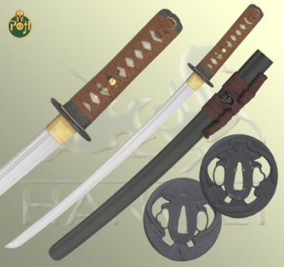 In Japan the traditional method of serving tea is a celebrated art form in itself. This highly ritualized ceremony is an involved process, the most elaborate of which can last hours and is reserved for the most distinguished of guests. Our Tea Culture Daisho (SH2331, SH2332) captures the essence of this important tradition. The Katana and Wakizashi are built upon a traditional Shinogi Zukuri style blade with Bo-Hi. The high-carbon blade is hand forged and differentially hardened using the traditional clay method. The Koshirae (furniture) feature the typical elements present in a Japanese tea ceremony. The handle is wrapped with suede leather in a Katati Make (battle wrap) style.